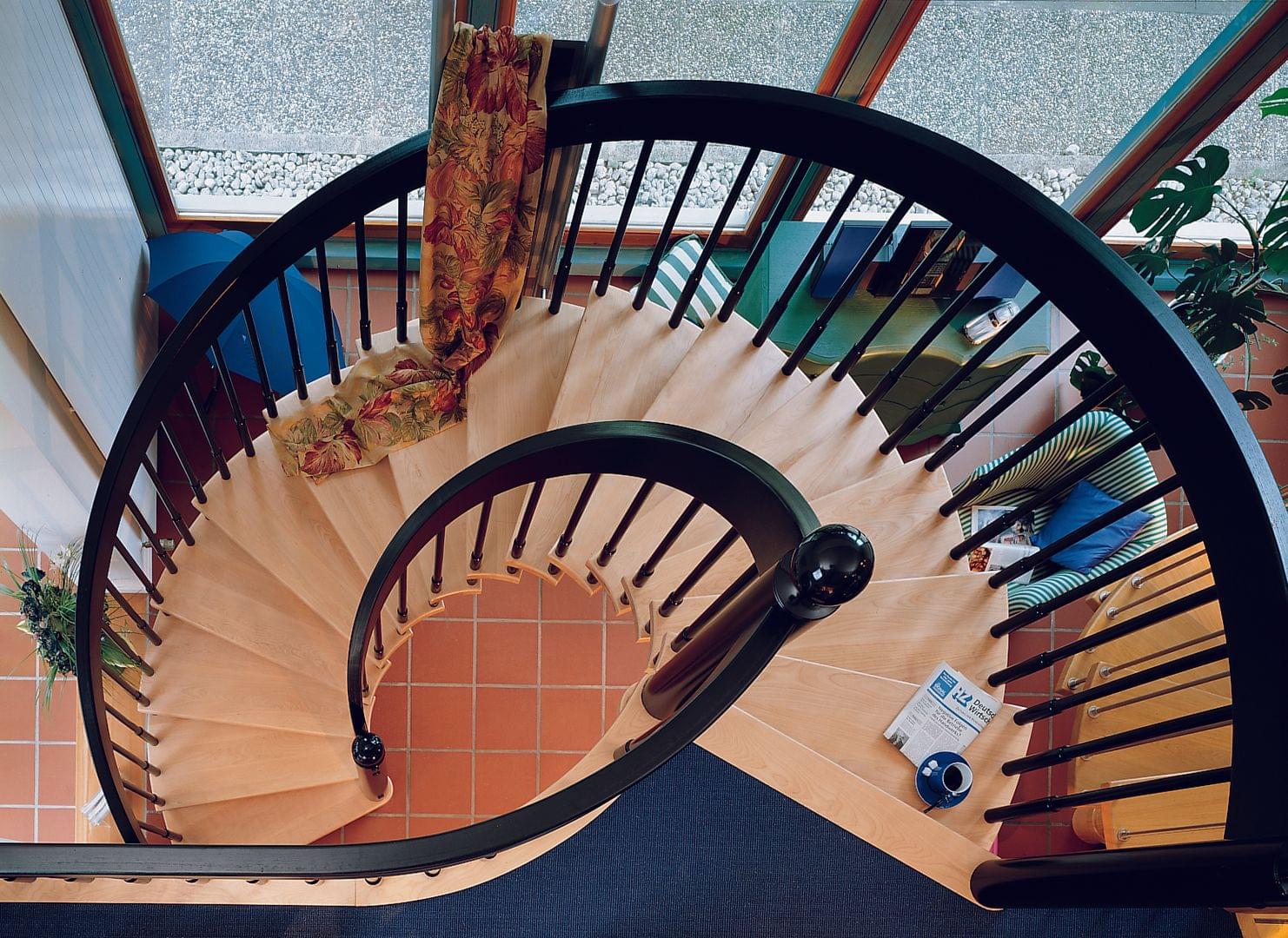 Wendeltreppe bzw. Massivholz-Spindeltreppe Edelstahl/Holz-Geländerstäbe Treppenmeister 360b
