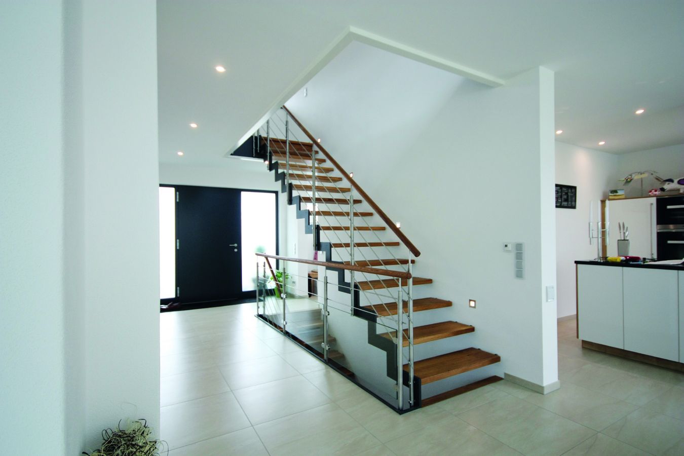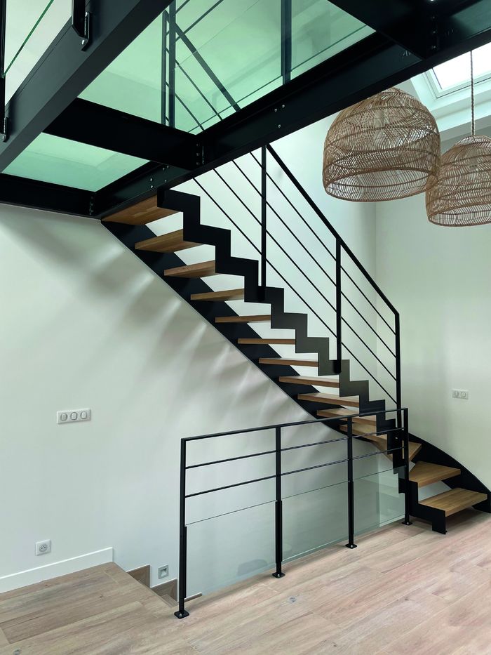 Stahlwangentreppe Ferro mit Glasgeländer und Holzhandlauf Treppenmeister 5072a