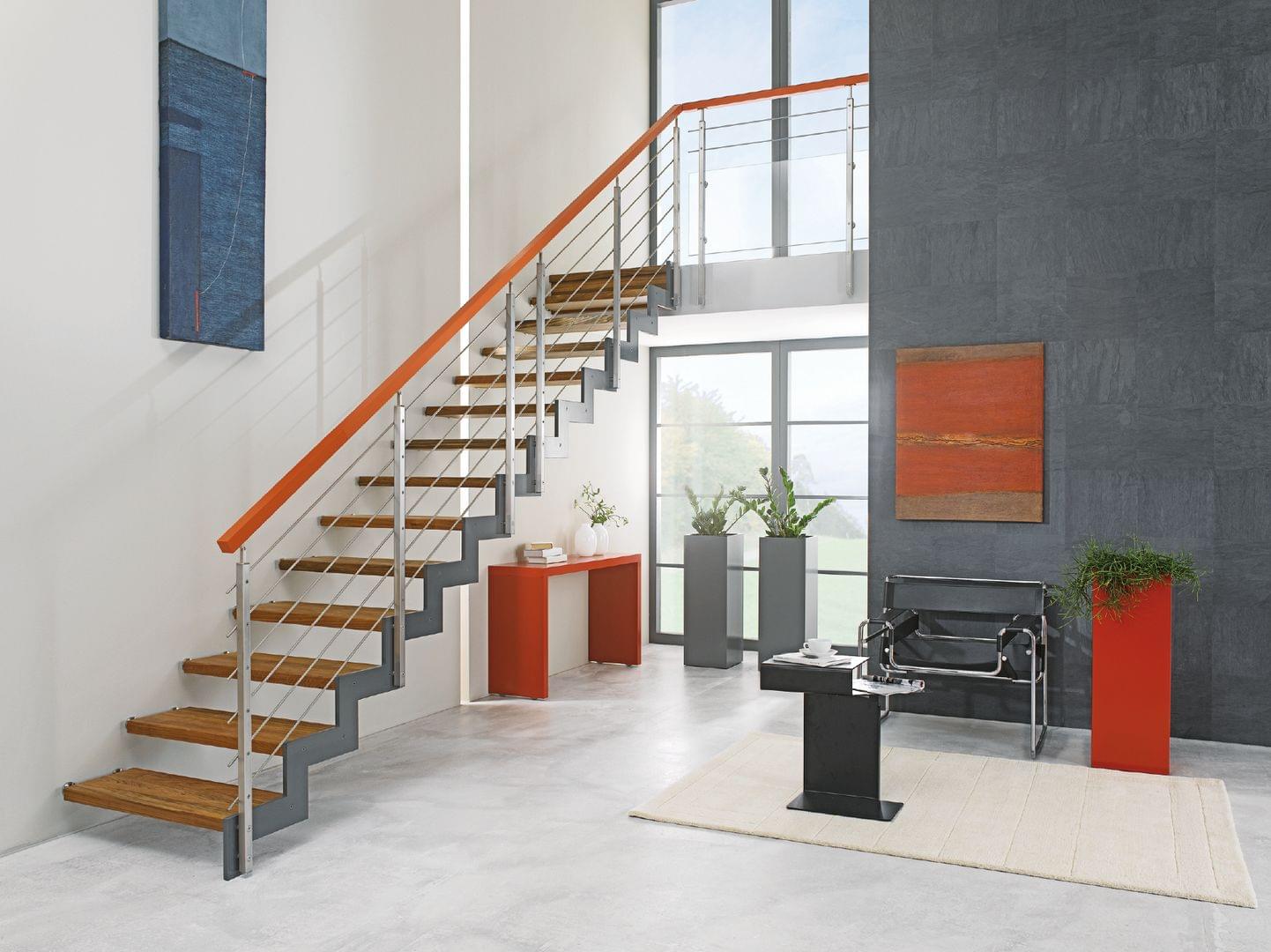 Stahlwangentreppe Ferro mit rotem Holzhandlauf und Holzstufen Treppenmeister 612b