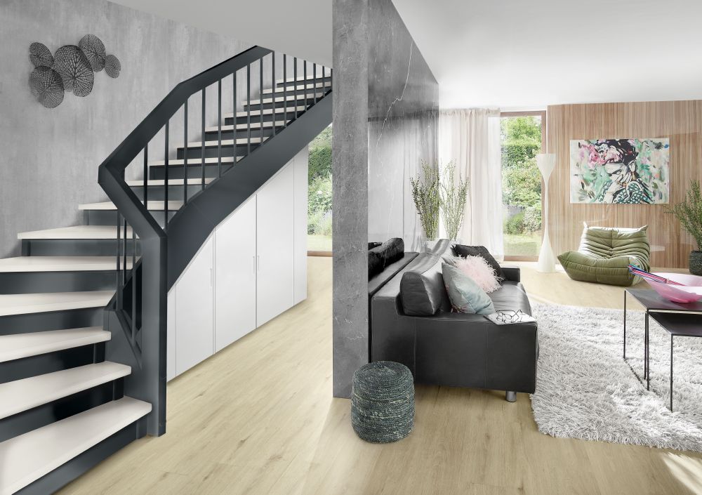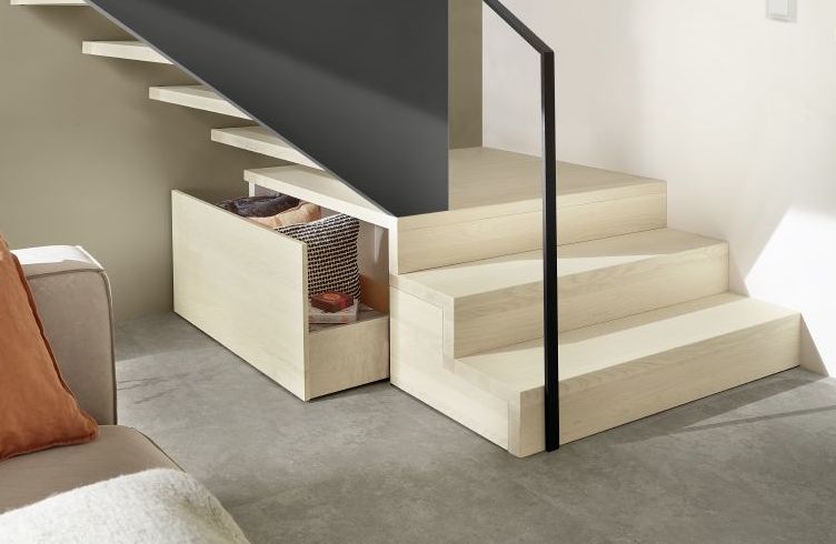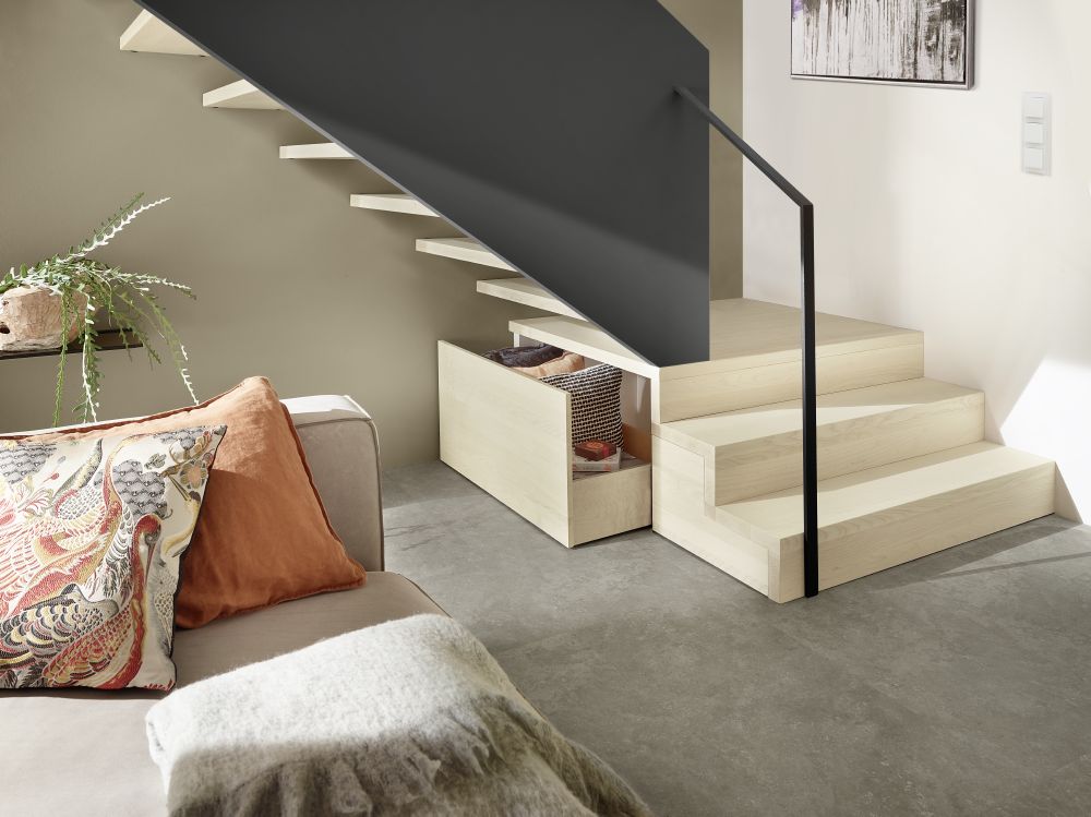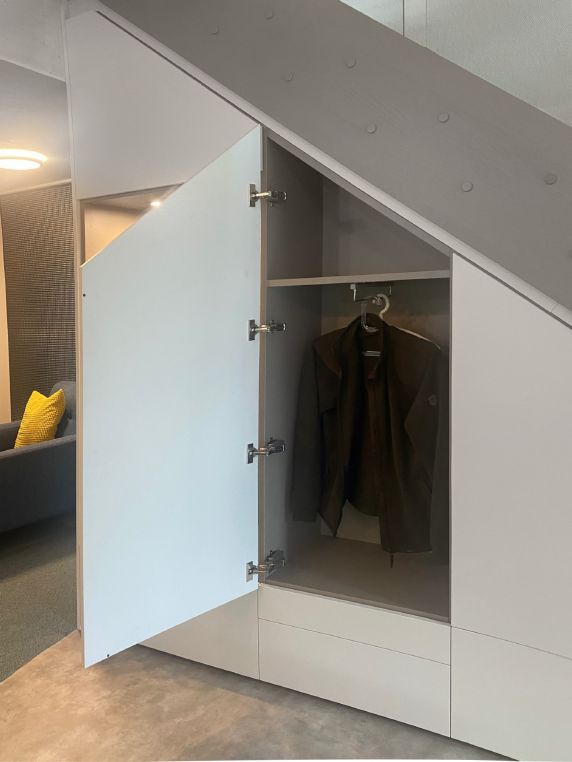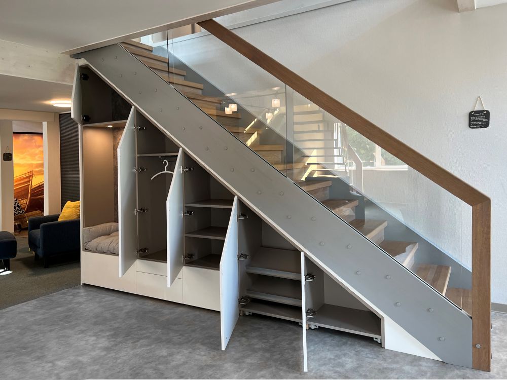 Bei offen sichtbaren Stufen erfordert die Gestaltung des Unterbereichs besondere Überlegungen. Ein geschlossener Schrank fügt sich oft nahtlos in das Gesamtbild ein und bietet maximale Diskretion. Ein individuell angefertigter Schrank aus Holz passt sich perfekt der Höhe und Breite der Treppenstufen an und nutzt jede Fläche vollständig aus.