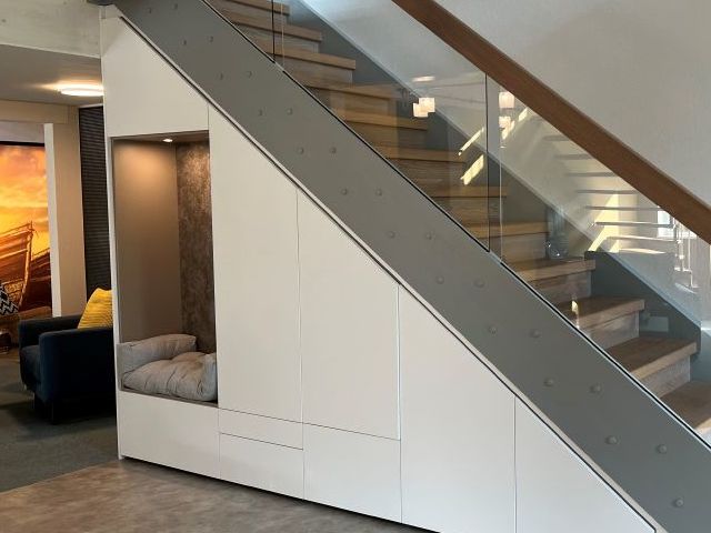 Ergreifen Sie die Gelegenheit, Ihren Wohnraum zu erweitern und gleichzeitig Ordnung zu schaffen. Die Stauraummöglichkeiten unter der Treppe sind so vielfältig wie Ihre eigenen Bedürfnisse. Wir von Treppenmeister stehen Ihnen mit kompetenter Beratung und präziser Handwerkskunst zur Seite!