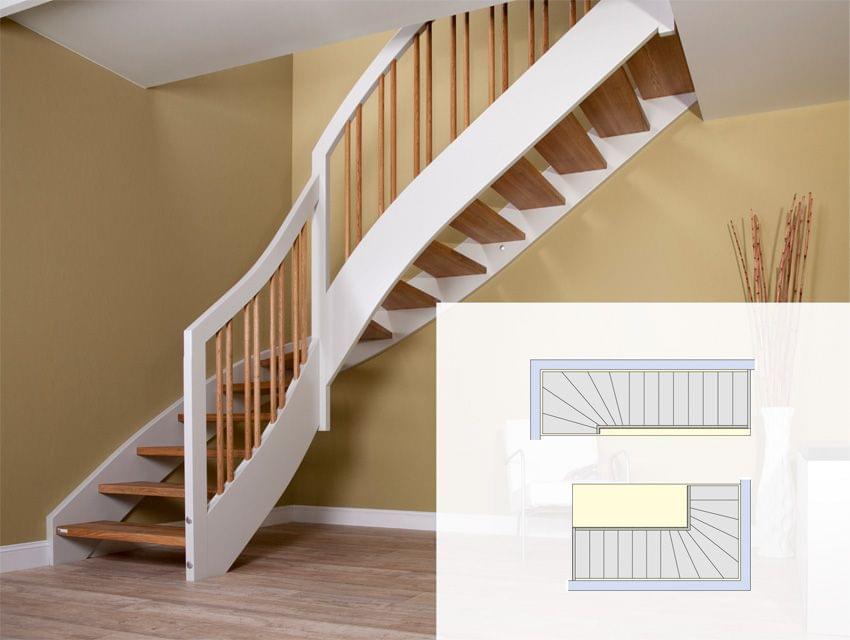 Die viertelgewendelte Treppe krümmt sich entweder im Antritt oder im Austritt. Diese Treppenform wird gerne verwendet wegen der günstigen Einbindungsmöglichkeit von planerischen Wünschen.