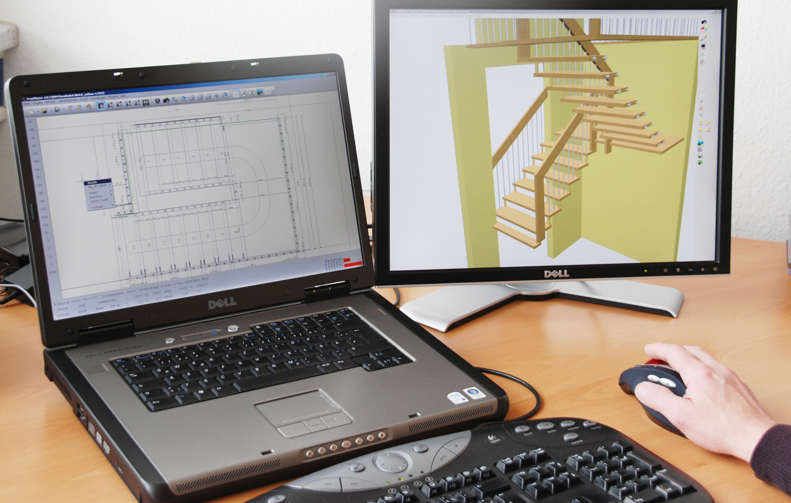 Aus den erfassten Aufmaßdaten und Ihrer Wunschausstattung planen wir Ihre Treppe mit Hilfe moderner Software. Alle Ausstattungsmerkmale und Berechnungsdetails werden dann an die Fertigungsabteilung weiter gegeben. Unser modernes CAD Programm erstellt eine 3D Grafik und zeigt Ihnen wie die fertige Treppe im Raum aussehen wird.